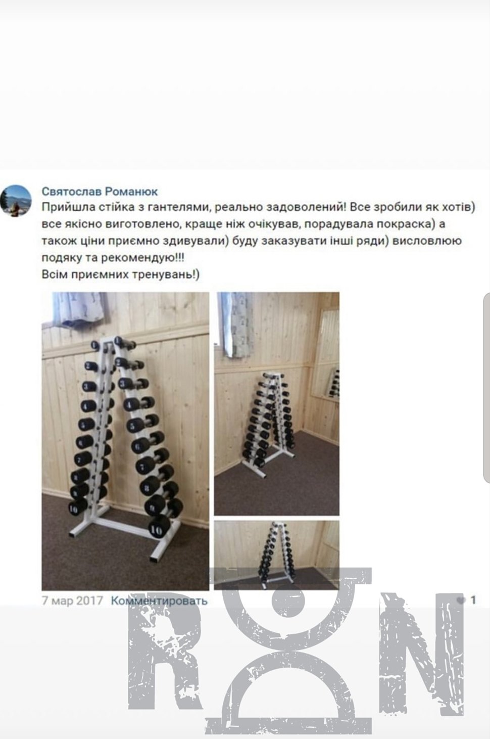Прийшла стійка з гантелями, реально задоволений! Все зробили як хотів) все якісно виготовлено, краще ніж очікував, порадувала покраска) а також ціни приємно здивували) буду замовляти інші ряди) висловлюю подяку та рекомендую!!!